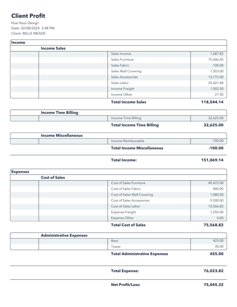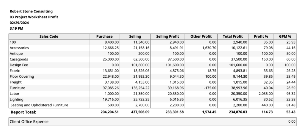 The Client Profit report allows designers to take a close look at one project and view all income (broken out by furniture, accessories, time billing), expenses (broken out by cost of goods, administrative expenses), and net profit and loss. The Client Profit report provides designers with a comprehensive look at the profitability of each project.