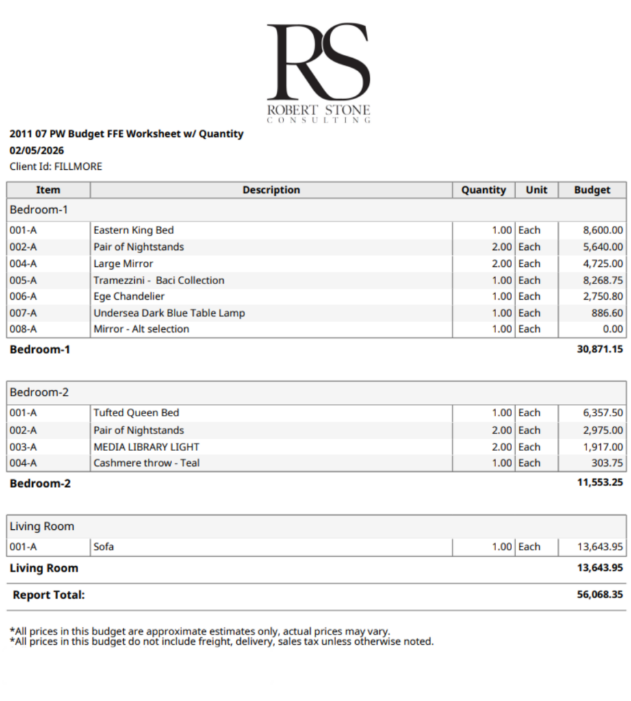 Designers often rely on room-based budgets when flexibility matters more than precision. This method takes very little time to set up, allows creative decisions to evolve naturally, and makes it easier to communicate an overall project budget to clients early on. It’s especially effective when selections are still in flux, and the design vision is still taking shape.