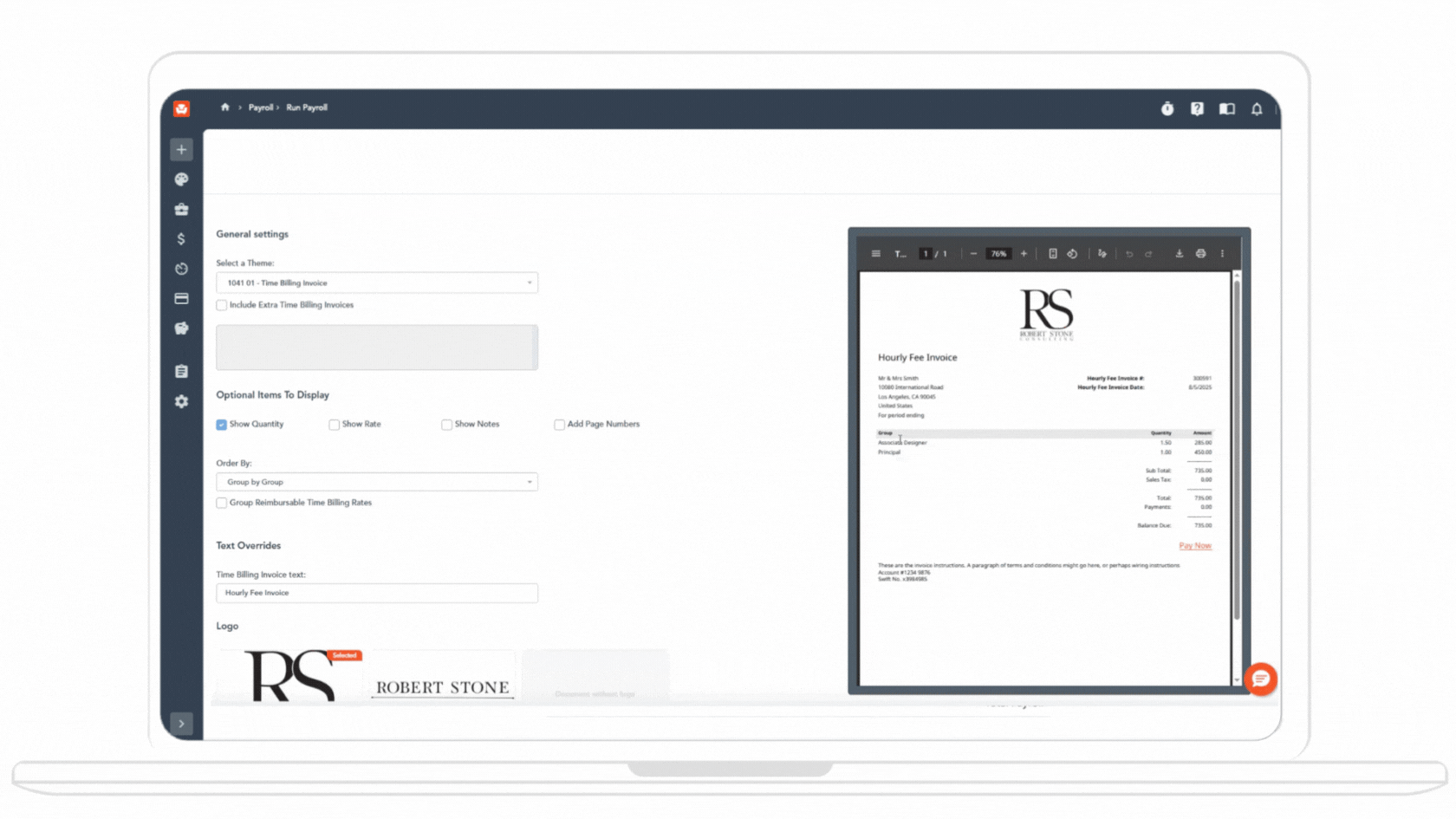 Invoices automatically group time entries by role and rate, creating a clean, transparent breakdown. This clarity supports productive pricing discussions and reinforces the professionalism of the firm’s brand.