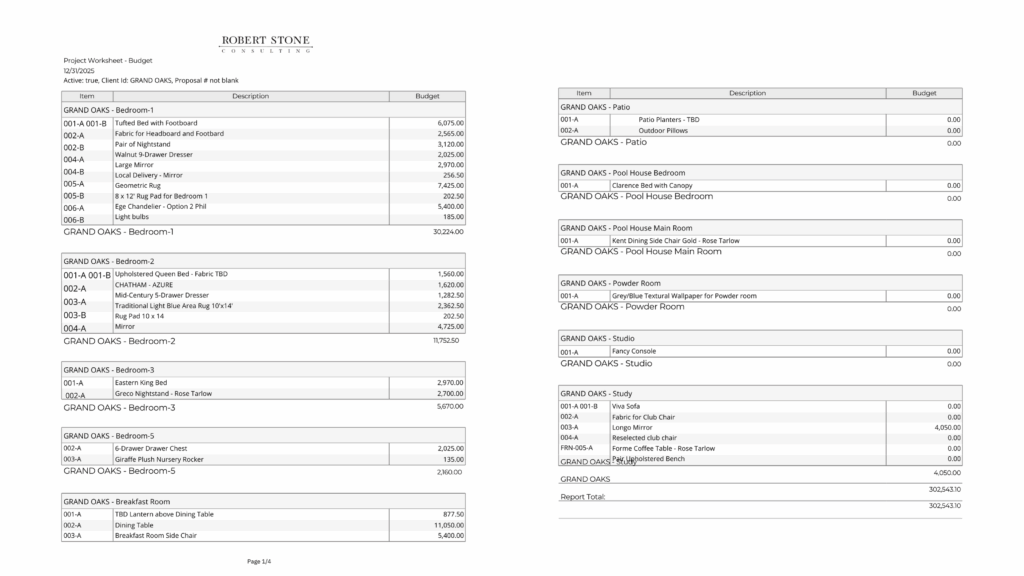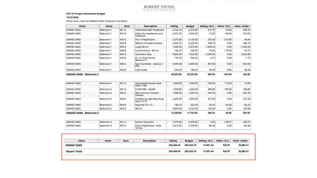 Once placeholder items are in place, designers can view the full project budget by running a Project Budget Report.