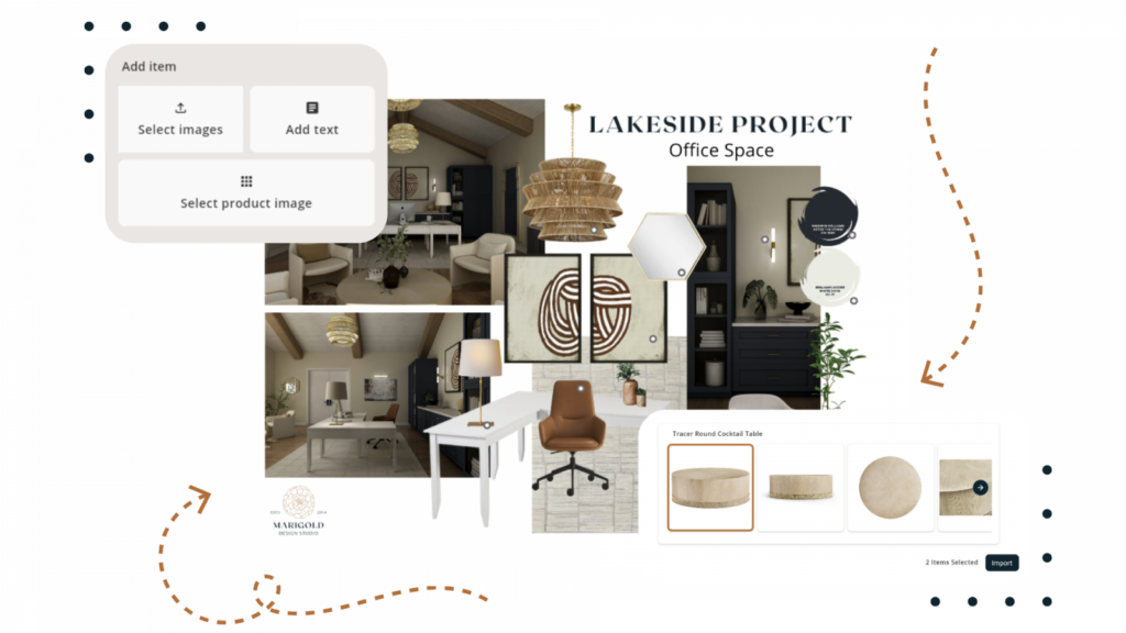 - Design Board Creation and Sharing: Present your design vision through polished mood boards that help clients give clear, confident feedback.