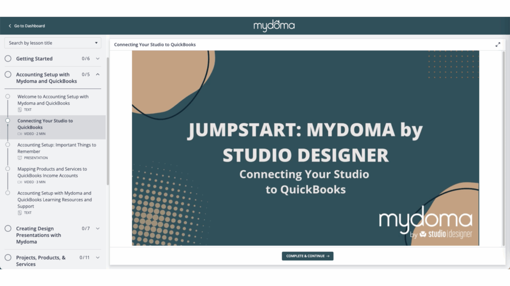 JumpStart for Mydoma combines flexible, self-paced online training, interactive group sessions, and personalized guidance from experts who truly understand design business needs. The program covers essential tasks like setting up client portals, creating design boards, and sending proposals, empowering designers to manage projects, clients, and payments with confidence.
